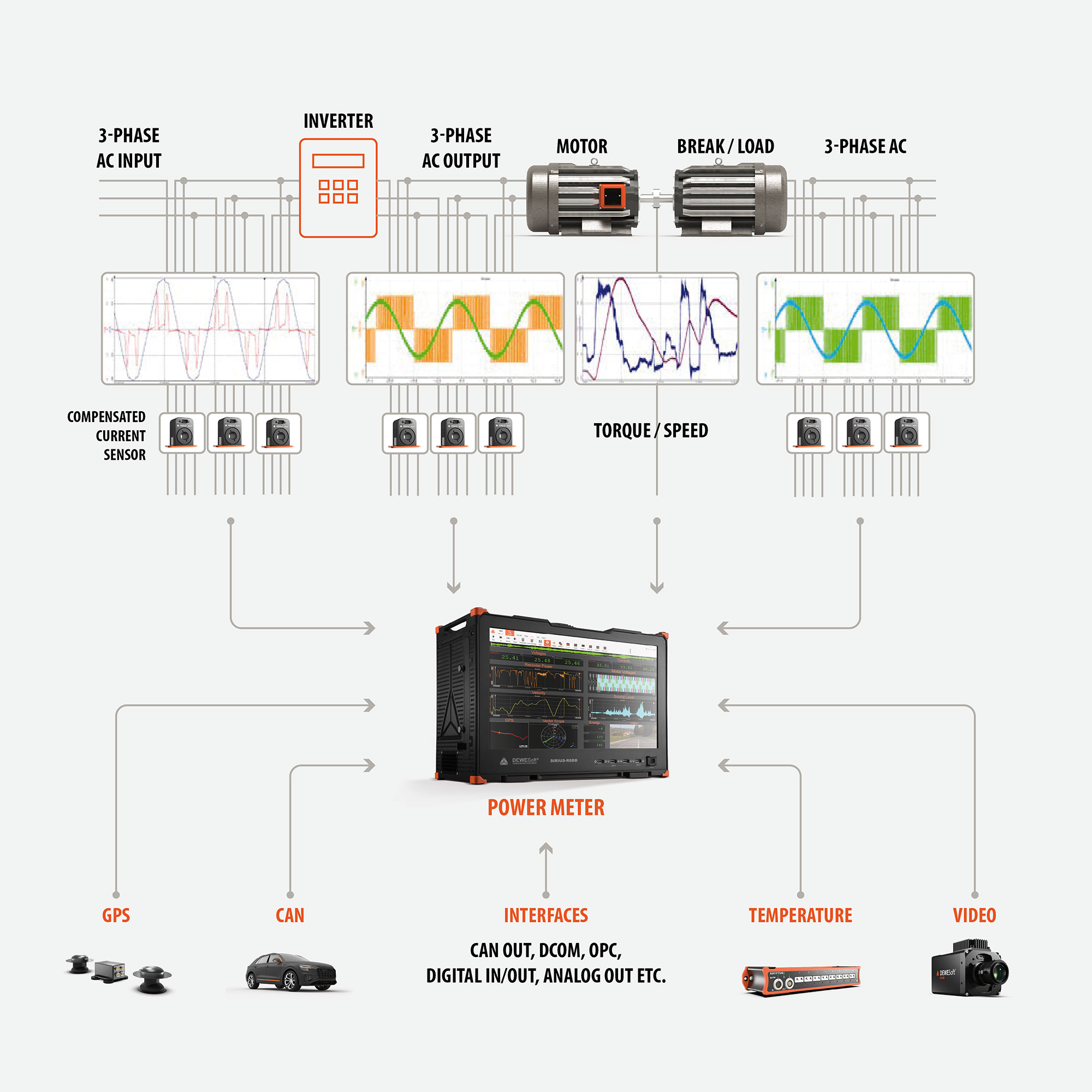 DEWESoftの電力アナライザは、さまざまなインバータの詳細かつ高精度な解析を提供します。モジュール式の高精度データ収録システムは、最大7相ACシステムを含むあらゆる入出力構成の計測をサポートします。