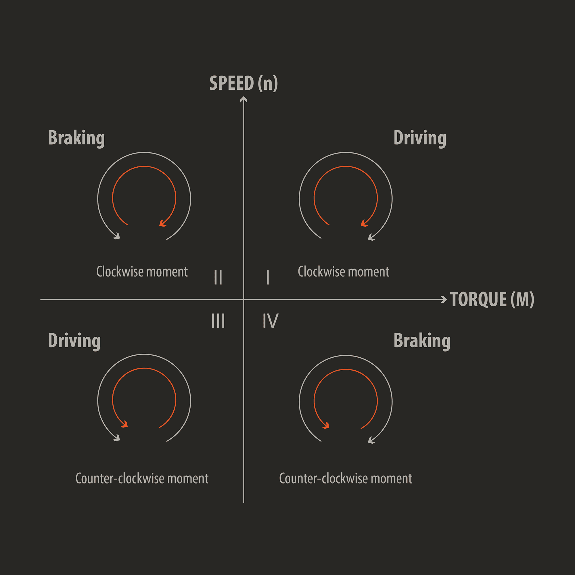 DEWESoftモータ解析システムを使用すると、モータの動作を4象限すべてにわたって観察できます。これにより、ユーザは、モータ駆動モードと発電モードにおいて、順方向と逆方向におけるモータ性能を理解し、解析することができます。