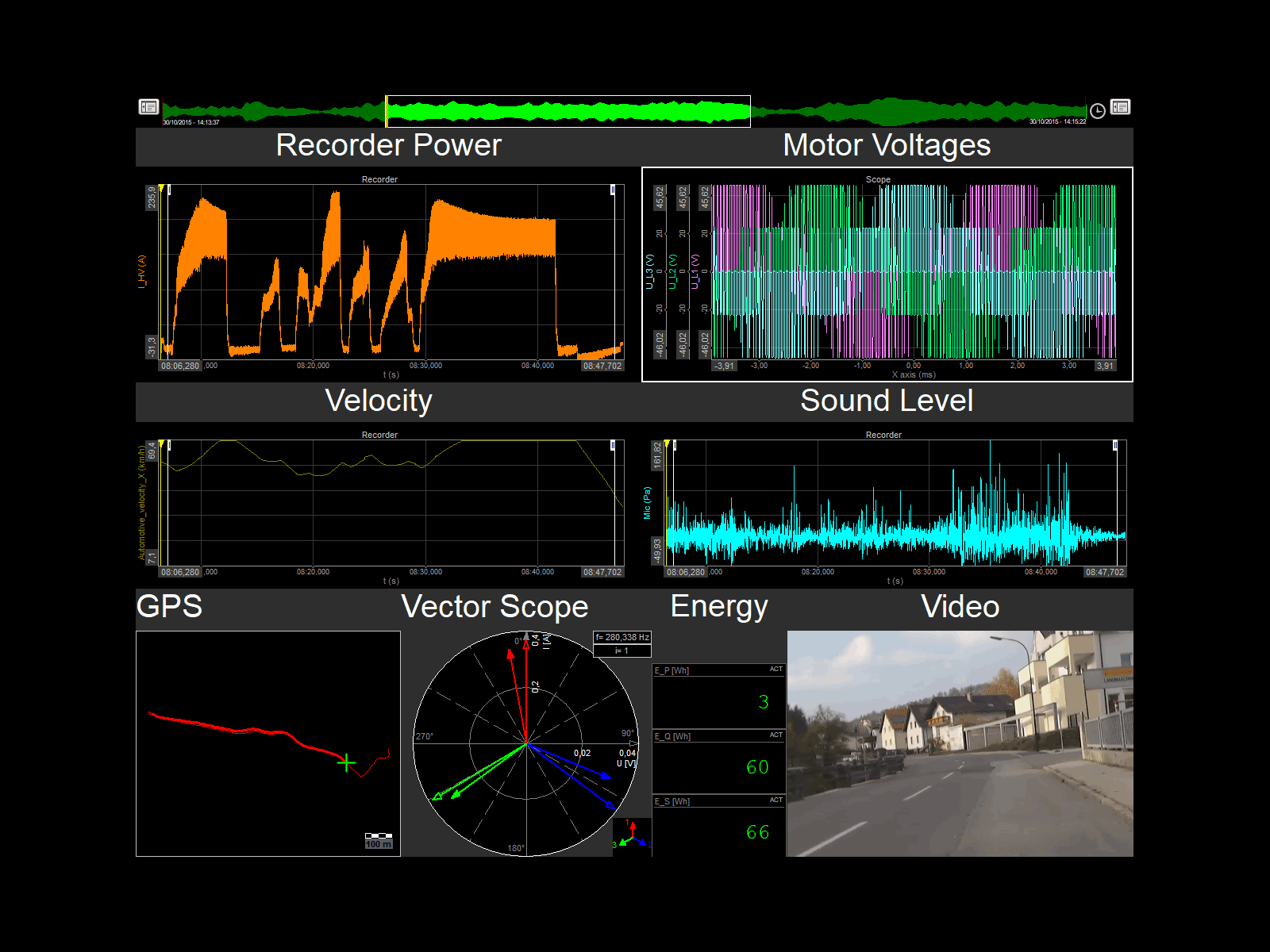 DEWESoftのパワーアナライザは、トルク,速度,騒音,温度,振動といった機械特性値も同期して計測できます。これにより電力と並行して熱,NVH,効率の計算も実行できます。