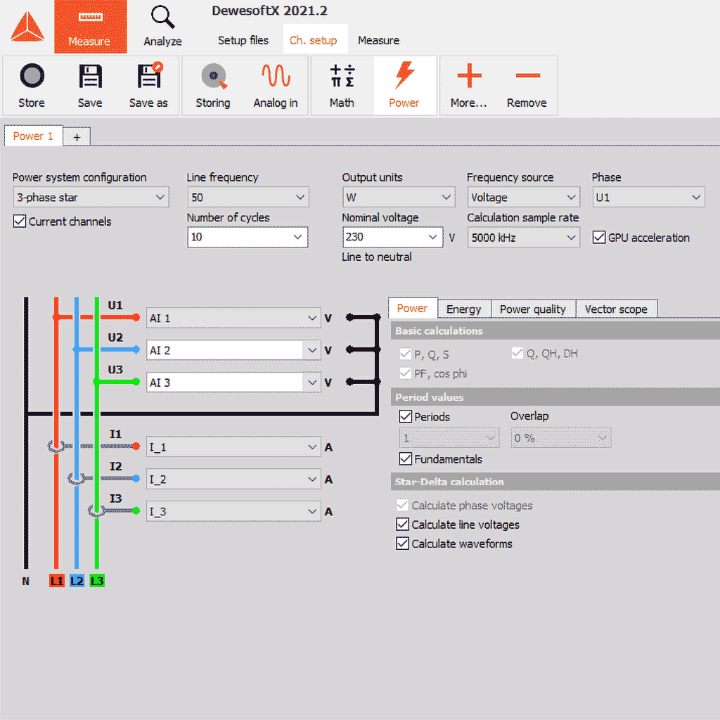 収録&解析ソフトウェアDewesoftXは、さまざまな配線図を視覚的に選択可能にし、あらゆる接続パターンに対する電力計算を提供します。