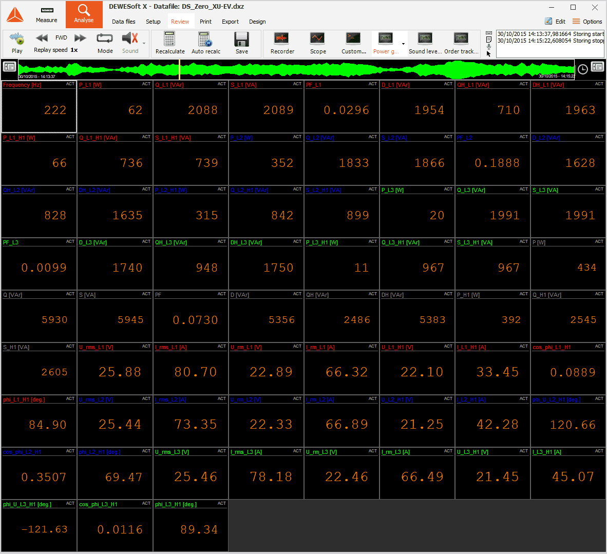 収録&解析ソフトウェアDewesoftXは、生の電圧および電流データを自動的に記録し、同時にすべての電力パラメータを計算して保存します。 これには以下が含まれます。