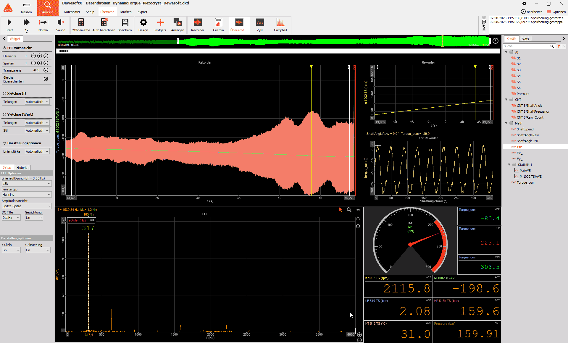 DEWESoftのパワーアナライザは、ダイナモやドライブトレインテストスタンドにシームレスに統合され、電源からモータまで、すべての個別コンポーネントのパワー計測を可能にします。また、ねじり振動解析(TVA)によるトルクと回転数,FFTと次数解析によるNVHデータ,耐久性試験のためのひずみ,温度など、すべてを1つの使いやすいソフトウェアで収録できます。